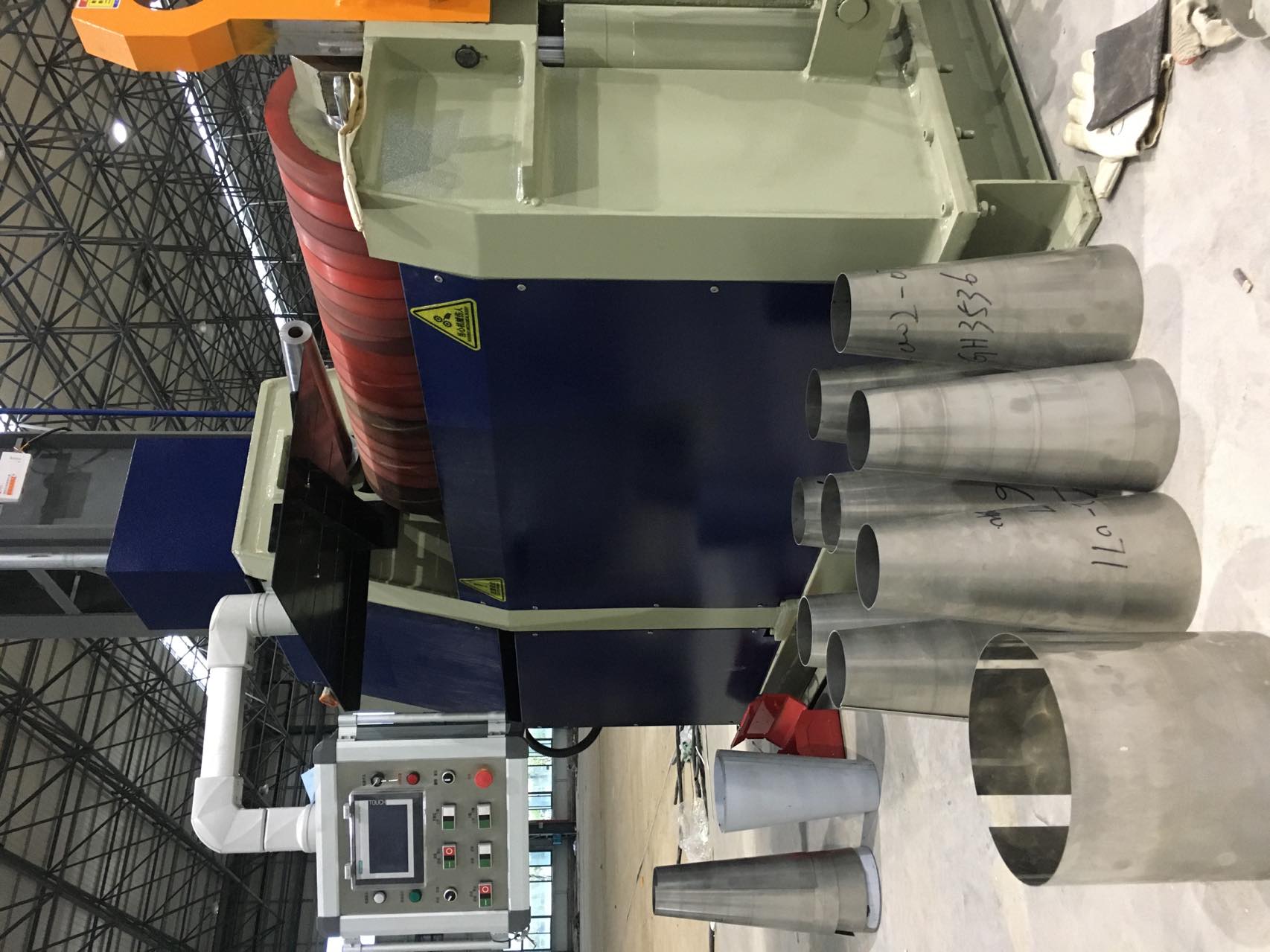 二辊卷板机为我公司生产的技术产品。其一辊为钢辊,另一辊为钢辊芯外包弹性层,板材置于两辊间并调整其间距,使其接触——加压——胶辊变形,板材随之局部变形,驱动两辊旋转,使板材连续弯卷成型。板料一次卷制即可加工成型,无明显直边,卷圆精度高。是高效、高精度、高度自动化的卷板加工设备。